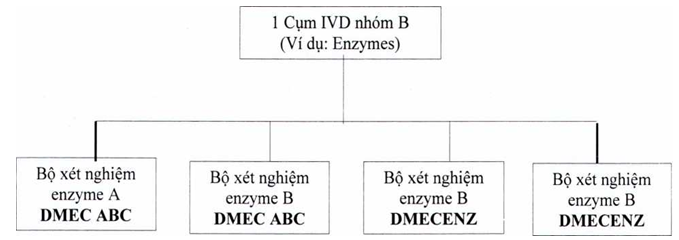 Sơ đồ ví dụ về nhóm thuộc cụm IVD nhóm B có 4 sản phẩm nằm trong nhóm Cụm Enzyme.