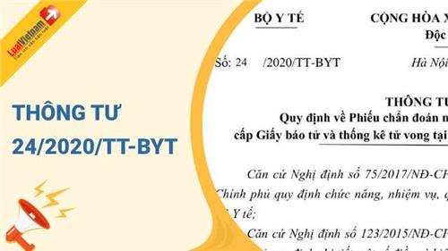 Ngày 28/12/2020, Bộ Y tế đã ban hành Thông tư 24/2020/TT-BYT quy định về Phiếu chẩn đoán nguyên nhân tử vong, cấp Giấy báo tử và thống kê tử vong tại các cơ sở khám bệnh, chữa bệnh.