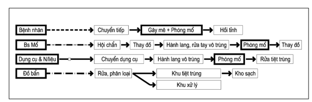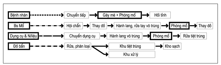4.2. Dây chuyền hoạt động của Khoa Phẫu thuật phải đảm bảo yêu cầu sạch bẩn một chiều, riêng biệt và được phân chia cấp độ sạch theo ba khu vực: