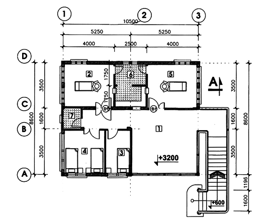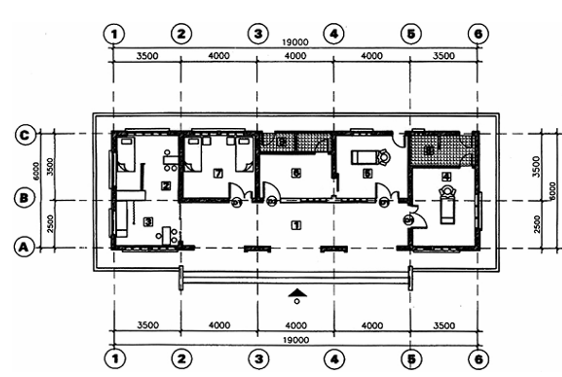 B.2.5 Đối với trạm có qui mô dân số nhỏ hơn 10 000 dân: tổng mặt bằng nêu ở hình B.4; mặt bằng khối kỹ thuật nêu ở hình B.5 (tầng 1) và hình B.6 (tầng 2).