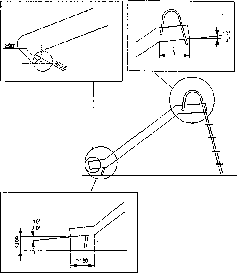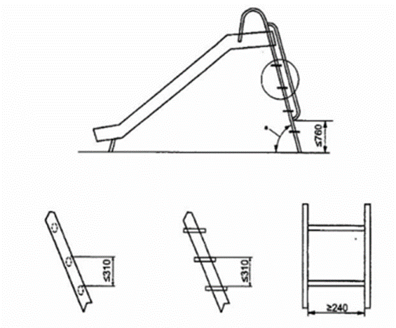 Các yêu cầu cho tay vịn [xem 4.6.3 (vùng bắt đầu, vùng trượt và vùng kết thúc trên cầu trượt c) đối với vùng bắt đầu và đối với thang trèo được đưa ra để ngăn cho trẻ khỏi bị ngã khi di chuyển vào vị trí ngồi ở vùng bắt đầu của cầu trượt.